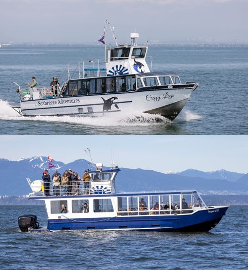 Three distinct orca types can be found off the coast of BC: Resident, Transient, and Offshore. Offshore orcas reside in deeper waters and are seldom seen on whale watching tours. Resident orcas are more common, but are critically endangered and avoided on our trips to protect their fragile populations. Transient orcas are apex predators, and are often spotted from spring to fall, hunting a diverse diet that includes larger marine mammals. Fun fact: orcas' vocalizations are pod-specific and allow them to communicate and socially bond.